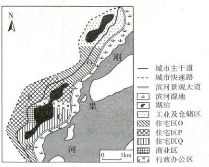 [2021·山东卷]刚果首都布拉柴维尔在老城区东北方向的滨河湿地规划建设新城。下图示意新城区的功能分区,其中住宅区规划为三个不同等级。O、P 区的住宅设计为装配式木质建筑,Q 区的住宅设计为钢筋混凝土建筑。据此完成 6、7 题。