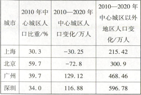 1.A【解析】根据表中中心城区和中心城区以外地区人口数量的变化数据可知,上海人口净增加185.17万人,北京净增加228.1万人,广州净增加597.58万人,深圳净增加713.66万人,所以四城市总人口都是净增加的。上海、北京中心城区人口数量减少,中心城区以外地区人口数量增加,故上海、北京中心城区人口比重下降。广州、深圳中心城区和中心城区以外地区人口数量虽然都增加,但中心城区以外地区人口增加量远大于中心城区人口的增加量,所以广州、深圳中心城区人口比重也在下降。故A项正确。