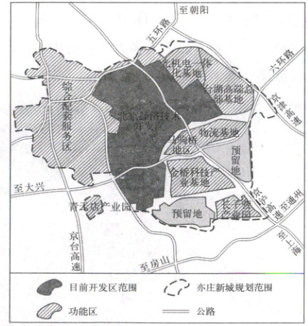 [2021·湖北卷]亦庄新城由 1992 年开始建设的北京经济技术开发区(简称开发区)发展而来,起步面积约 4 平方千米,目前面积已达 66 平方千米。根据《亦庄新城规划(2017 年—2035 年)》,未来将建成为面积达 225 平方千米的北京科技成果转化承载区和产城融合、宜业宜居的综合新城。下图示意亦庄新城规划功能区布局。据此完成 8~10 题。