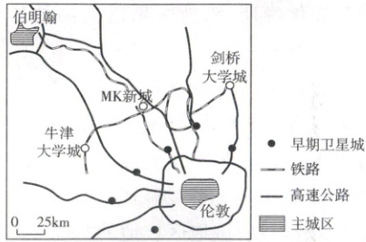 [2021·福建卷]下图中,卫星城和新城的建设目的是疏解伦敦主城区人口。早期卫星城以工业为主且工厂相对集中,人口 3~6 万,道路呈环形放射状。MK 新城建于 1971 年,以服务业为主,道路呈网格状。2014 年起,MK 新城依托周边地区资源,推进“智慧城市”建设,即时提供各类数据,促进通信、教育、社区和商贸等发展。2020 年,MK 新城人口约 27 万。据此完成 11~13 题。