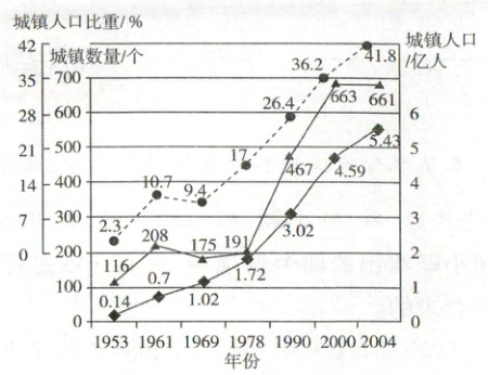 [2022·江苏洪泽中学高一期中]读某国城镇人口数量、城镇数量和城镇人口比重变化统计图,完成 9、10 题。