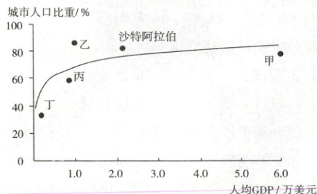 8.D【解析】沙特阿拉伯石油资源十分丰富,人均GDP高是因为石油的开采和出口,A项错误。沙特阿拉伯的城镇化水平已经较高,目前发展速度较慢,B项错误。由于需要开发石油资源,劳动力不足,国际人口迁移以迁入为主,C项错误。国内沙漠广布,适合人类居住的环境有限,人口主要集中在城市,因此城镇化水平高与国内沙漠广布有关。故选D项。