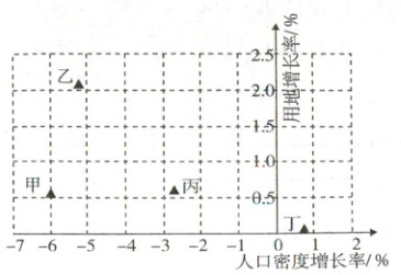 11.A【解析】城镇化后期的特点是城镇化水平高,发展速度慢,甚至出现逆城镇化现象,据此进行分析可知,在图中甲、乙、丙、丁四城市中,甲城市人口密度增长率为负值且最低,加上其城市用地增长率较低,说明甲城市目前发展缓慢,判断该城市处于城镇化的后期,A项正确。乙城市用地增长率较高,未处于城镇化后期,B项错误。丙城市人口密度增长率虽然为负值,但与甲相比,数值较高,加上城市用地增长率大于0,说明丙城市目前城镇化水平呈上升趋势,未处于城镇化后期,C项错误。此阶段丁城市人口密度增加,说明城镇化的进程在加快,未达到城镇化后期,D项错误。