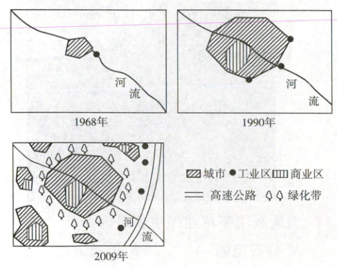21. 下图为某大城市 1968 年、1990 年和 2009 年同比例尺平面示意图。读图,完成下列要求。(17 分)
