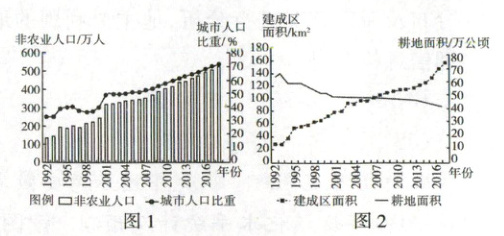 (1)由图1可知非农业人口增加,即城市人口增加;同时城市人口比重也在增加,这是城市化最基本的标志。由图2可知建成区面积增加,即城市用地面积增加,这是城市发展的基本特征。