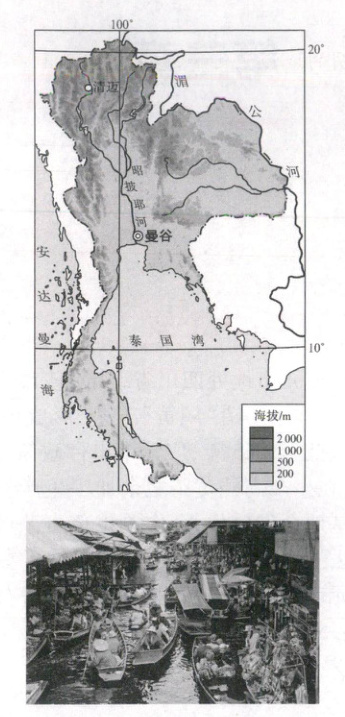 (1)结合图文信息可知曼谷是泰国首都和最大城市,地跨湄南河两岸,地势低洼、河网密布。河流提供充足的水源和便利的水运条件,运输成本低,当地居民依河而建,沿河地区人口密集,交易便利,市场需求量大,借助便利的水上交通发展水上市场,历史悠久,成为传统习俗,而迅速发展的旅游业又促进了水上市场的进一步发展。