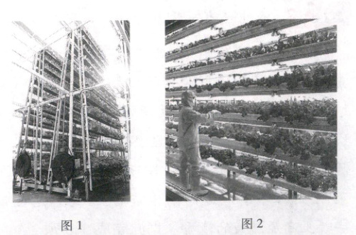 [2022·河南新乡第一中学高一期中]目前世界各地的垂直农业各具特色。新加坡的“天空绿蔬”工厂(图 1),占地较小,各种蔬菜垂直排设在 A 字形框架上“轮转生长”,让人们实现城市菜园的梦想。英国伦敦北约克郡的垂直农场(图 2),采用水耕栽培和 LED 照明系统,可全年为本地市场提供新鲜蔬菜。据此完成 1、2 题。