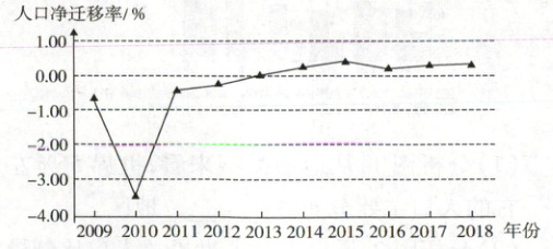 [2022·山东济宁高一期中]人口净迁移率是指一个地区在一定时期内迁入人口数与迁出人口数的差值占总人口数的百分比。下图示意安徽省 2009—2018 年常住人口净迁移率变化。据此完成 4、5 题。
