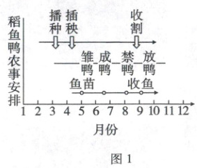 [2021·安徽安庆高一期末] 在黔东南的侗乡(位于贵州省),有一种保留了上千年历史的“稻鱼鸭系统”农业生产类型。当地根据自然条件,形成了在水稻田中“种植一季稻、放养一批鱼、饲养一群鸭”的农业生产方式。图 1 示意这种生产模式及其农事安排,图 2 为该生产模式景观图。据此完成 3、4 题。