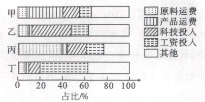 19.B 【解析】由材料可知,疫苗制造工艺复杂,耗时较长,疫苗研发制造需要较高的科技,属于技术指向型工业。读图可知,甲产品运费成本占比高,应靠近市场,属于市场指向型工业,A项错误。乙科技投入占比高,属于技术指向型工业,B项正确。丙原料运费占比最高,应靠近原料产地,属于原料指向型工业,C项错误。丁工资投入占比最高,属于劳动力指向型工业,D项错误。