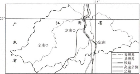 [2022·广东茂名高一期中]被誉为“重稀土之乡”的江西省龙南县,20 世纪 70 年代开始发展稀土产业,成为目前全国唯一拥有完整稀土产业链的县,尤其在稀土发光材料、永磁材料等多种电子信息产业基础性材料加工方面具有优势。近年来,“三南”(龙南、全南、定南)共商推动产业协同发展,围绕电子信息等主导产业在粤港澳大湾区进行招商,加速产业集群发展。下图为龙南县及周边区域图。读图,完成 12、13 题。