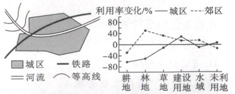 20.D【解析】图中数值反映各类土地利用变化情况,大于0表示面积增加,小于0表示面积减小。图中城区建设用地面积增长说明该城市没有出现逆城市化现象,A项错误。郊区耕地面积减少,说明郊区种植业发展下降,B项错误。结合图示可知,该城近十年城区和郊区建设用地面积都在增大,表明人口均在增加,C项错误。郊区林地、草地和水域面积增大,说明郊区生态环境改善,D项正确。