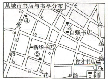 读某城市书店与书亭分布图,完成 10、11 题。