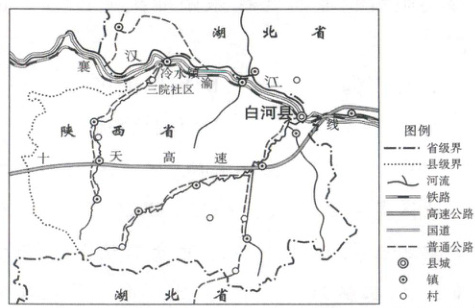 三院社区位于陕西省安康市白河县冷水镇的高山地区,居民以移民搬迁为主,经过实行土地流转、建立农村合作社、社区工厂等措施,实施“还山上生态林,建山下新社区,办社区新工厂,育时代新农民”的村级发展模式。大规模种植核桃、牡丹等,发展乡村旅游,促进乡村振兴,2017年被评为“全国文明村”。下图为三院社区位置示意图。