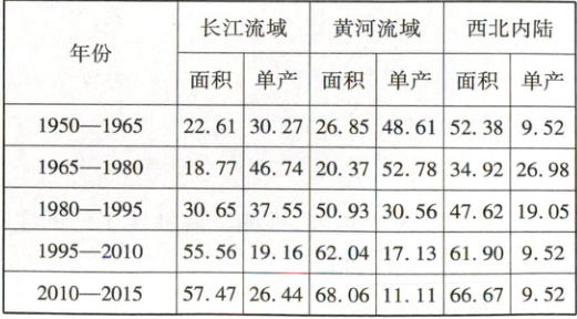 [2021·广东卷]长江流域、黄河流域和西北内陆地区是我国三大产棉区。2020 年,新疆棉花产量占全国和世界总产量分别达 87.3%和 20%以上,机械采摘率已达 69.8%。下表反映三大产棉区不同时段面积和单产对棉花产量的贡献率变化。据此完成 7~9 题。