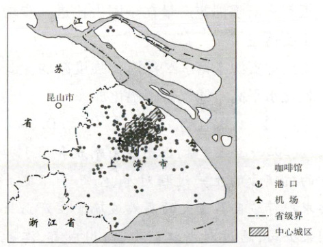 【解析】(1)客户去咖啡馆消费,支撑咖啡馆蓬勃发展,客户消费水平高,主要从事第三产业,故支撑其发展的产业类型为第三产业。客户消费水平高,推测其收入高,主要来自金融、商贸、信息技术、策划、法律咨询、房地产等高端服务业。(2)由图可知,整体上,该品牌咖啡馆在上海空间分布不均,再看局部地区,中心城区密度较大,郊区密度较小;但在机场附近相对较多。(3)由材料可知,该品牌知名度高,是休闲会友、商务交流的重要场所,故主要目标消费人群是收入较高、消费能力较强的人员,如高端第三产业从业人员(企业白领)。另外,该品牌是国际连锁品牌,有文化内涵,主要目标消费者也包含喜爱潮流文化的年轻消费者,如大学生等。(4)由图可知,昆山邻近上海,而上海咖啡及其烘焙产品市场需求量大,布局在昆山便于产品快速运抵市场;昆山邻近上海,受上海的辐射带动作用强,布局在昆山便于接受上海的资金和技术扩散;便于借助上海的基础设施,如机场、港口等,方便从国外输入原料、输出产品;昆山地处上海附近,部分上海就业人口在昆山居住,昆山也有该咖啡品牌的消费需求;与昆山相比,上海土地租金高、劳动力成本高,不适合建设大型产业园。故选址在昆山建设咖啡创新产业园。