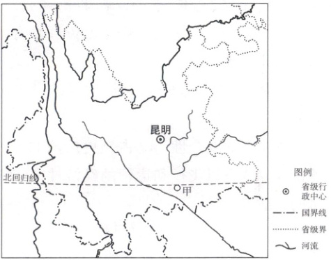 [2022·江西萍乡高一期末]下图中甲市葡萄产量大,远销国内外。近年来该市种植的早熟葡萄品种第一茬在每年5、6月份上市,而通过盖棚、摘心、促花等措施改变了露天葡萄一年一收的现状,实现了第二茬上市,第二茬上市时间在11月份到次年1月份。第二茬葡萄产量比第一茬略低,但甜度较高,经济效益是第一茬的3倍左右。据此完成3~5题。
