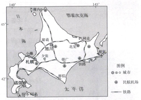[2022·辽宁铁岭高一月考] 北海道农林渔业发达,煤炭等矿产资源丰富,铁路曾是当地主要的运输方式。21 世纪以来,大飞机及直升机运输量迅速上升,多条铁路废弃,多个站点关闭。下图示意北海道岛铁路网和民航机场分布。据此完成 13~15 题。