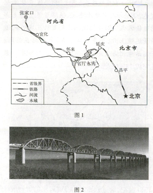 [2022·山东济南高一月考] 官厅水库是北京市主要的水源地之一。经反复研究,京张高速铁路官厅水库特大桥最终采取钢梁顶推架设方案,钢梁在岸上像“搭积木”一样拼装好,再从岸边向湖心顶推就位。图 1 为京张高速铁路线路图,图 2 为官厅水库特大桥。据此完成 16~18 题。