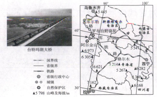 (3)根据材料当中的关键信息“台特玛湖湿地(塔里木河、车臣河的尾闾湖)”,可得该段采用桥梁方案的优点:利于疏通风沙流,防止风沙阻断水流;为野生动物迁徙留出通道,保护生态;减少占用湿地,避免湖区分割。