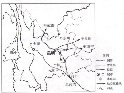 (2)据所学知识可知,云南山地面积广,滇西北高山连绵,海拔高,峡谷纵横,云南境内多高山阻隔,铁路和公路运输的建设难度大。省内城市分布较分散,且受山地、河流阻隔,路上交通往来耗时长,效率低。云南地处边境,途径该省的外贸往来频繁;旅游资源丰富且较分散,距东部地区较远,外贸和旅游都对运输速度快、效率高的航空需求迫切。云南地处内陆高原,平均海拔在2000米上,滇西北高山连绵,海拔多在3000米以上,空气稀薄,能见度高,发展航空运输的条件优越。从航空运输特点看,航空运输受地面状况影响小,可以有效地突破地域广、距离远、地形复杂的制约,且运输速度快。