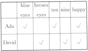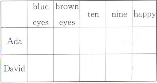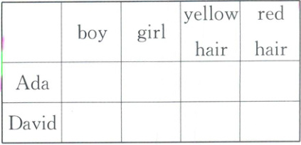 Look! They (他们) are my friends. The girl is Ada. She is ten, Her hair is yellow, Her eyes are blue. She feels happy. The boy is David. He is nine. He has red hair and brown eyes. He is nice. He feels happy, too.
