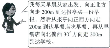 刘明早上从家出发,向正西方向走了约 500m,来到早茶店吃早茶;吃完早茶后又向南偏东 30°方向走了约 1000m 来到购书中心买书;买完书接着又向北偏东 45°方向走了 800m 来到同学张强家。