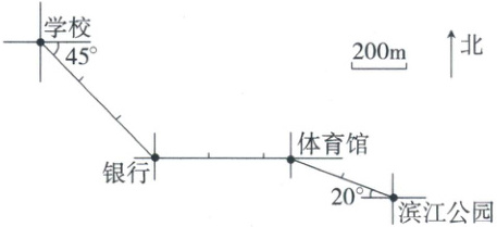 (1)从学校出发,先向( )偏( )( )°方向走( )m 到达银行,再向( )走( )m 到达体育馆,最后向( )偏( )( )°方向走( )m 到达滨江公园。