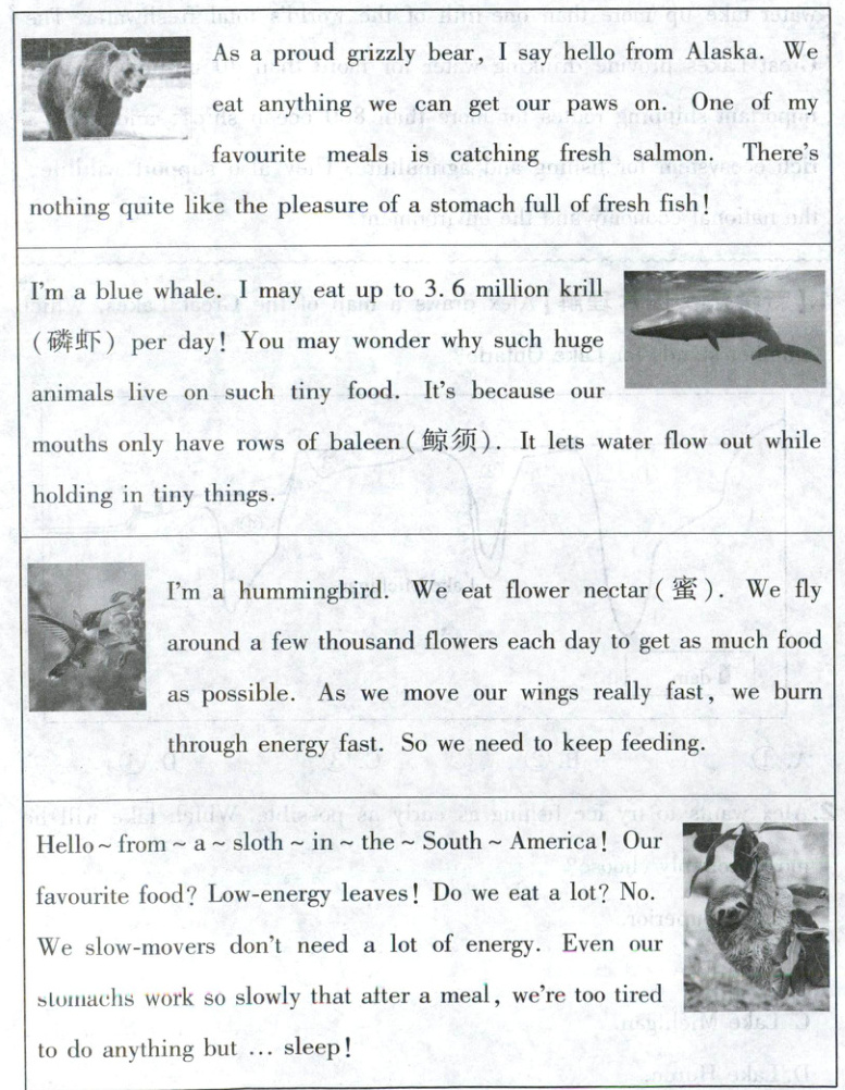 【语篇导读】本文是一篇应用文。文章通过第一人称自述的形式介绍了棕熊、蓝鲸、蜂鸟和树懒这四种动物各自的饮食喜好及相关习性等。