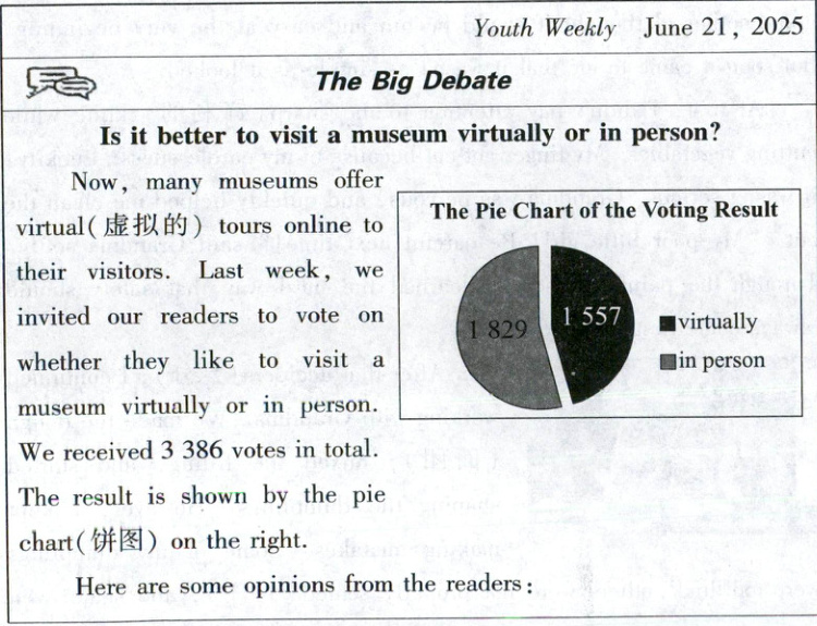 【语篇导读】本文是一篇新闻报道。文章是《青年周刊》关于“参观博物馆是选择虚拟方式更好还是亲临现场更好”的辩论专题的读者投票结果,并给出了四位读者各自的观点。