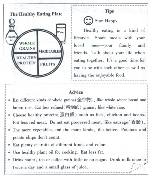 【语篇导读】本文是一篇说明文。文章介绍了健康饮食盘的食物构成,并针对如何实现健康饮食提供了具体的建议和小贴士。