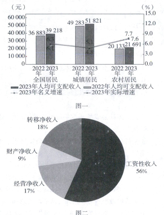 13. 图一是 2023 年全国及城乡居民人均可支配收入与增速情况,图二是 2023 年全国居民收入来源情况。
