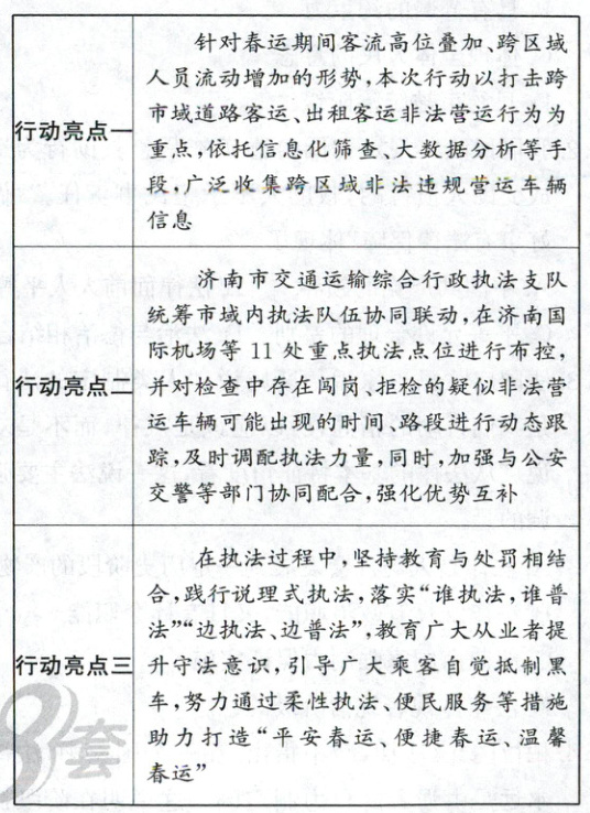 【解析】法治政府 首先,审设问,明确模块知识为《政治与法治》,题型是措施类。其次,要明确角度是行政执法问题,针对的是我国政府如何做的问题,找准教材的切入点。最后,从材料中的三个行动亮点中找准关键信息,对接教材知识原理,进行思考整理作答。材料具体分析如下:①济南市立足行政执法工作实际,坚持问题导向,不断强化行政执法工作的全方位、全流程监督,严格履行常态化、长效化监督,体现了我国政府坚持问题导向,完善行政执法体制机制,强化行政执法监督问责。 ②针对春运期间客流高位叠加等形势,依托信息化筛查、大数据分析等手段,广泛收集跨区域非法违规营运车辆信息,体现了政府创新行政执法方式,利用数字赋能行政执法,有效提升了政府社会管理效能。 ③济南市交通运输综合行政执法支队统筹市域内执法队伍协同联动,同时,加强与公安交警等部门协同配合,强化优势互补,体现了政府开展执法联动,加强部门协同,形成执法合力,提高执法水平。 ④在执法过程中,坚持教育与处罚相结合,通过便民服务等措施助力打造温馨春运等,体现了通过加强执法队伍建设,提高行政执法人员能力素质等,全面推进严格规范公正文明执法。