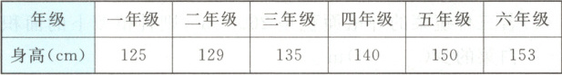 (1)折线图:横坐标为年级,分别是一年级、二年级、三年级、四年级、五年级、六年级,纵坐标为身高/cm,从一年级到六年级身高分别为125、130、135、140、145、155左右