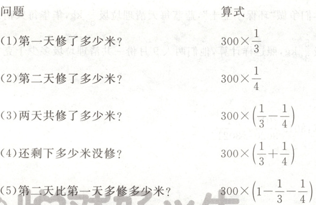 (4)还剩下多少米没修? 300×(1 - $\frac{1}{3}$ - $\frac{1}{4}$)