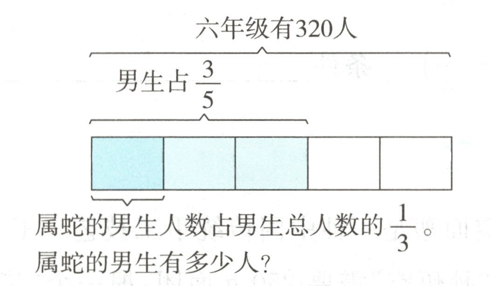 2. 可以求出属蛇的男生人数占()的几分之几,列式为();然后求出属蛇的男生有多少人,列式为();合并成综合算式为()。