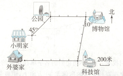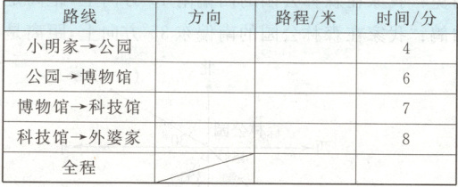 (1)下面是小明从家到外婆家的过程,根据上面的路线图完成下表。