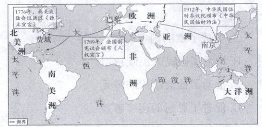 【解析】近代世界的思想解放 第一小问,根据地图信息并结合所学知识可知,17世纪英国出现早期启蒙思想,18世纪以法国为中心,18世纪后期扩展到欧洲其他国家和北美地区,再传播到亚洲等地。第二小问,结合所学知识可知,启蒙思想传播的世界意义是直接推动了美国独立战争和法国大革命,有助于这些国家建立资产阶级统治;启蒙思想也成为半殖民地人民争取民族独立的精神武器。