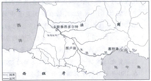 2. 如图为法国1681年顺利完工的大运河,现成为欧洲历史最悠久且目前仍在通航的运河之一。下列关于该运河开筑的历史背景,叙述正确的是(