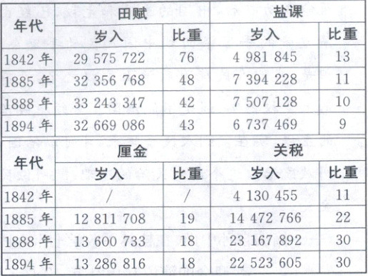16. 下表是1842—1894年晚清财政收入结构比较