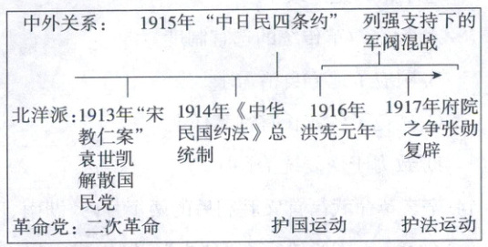 5.A 民国初年的政治制度 材料反映了北洋军阀统治时期,北洋派对内制造“宋教仁案”、复辟帝制等,对外投降卖国的行为,针对这些倒行逆施,革命党先后发动二次革命、护国运动和护法运动等,体现了当时民主与专制的斗争,A项正确;材料主旨并非政党政治,排除B项;“革命程序”论是指孙中山关于宪政建设的程序构想,与材料中“中外关系”无关,排除C项;1916年袁世凯去世后,形成军阀混战格局,排除D项。