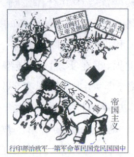 10. 如图为反映北伐战争的漫画:愤怒的民众正将象征“民众的力量”的巨棒打向“帝国主义”和“军阀”,后面很多民众手举棍棒、标语牌摇旗呐喊,标语牌上写着“农工兵商学大联合”“联合起来打倒军阀及一切帝国主义”。该漫画反映了 (