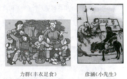 4. 如图是20世纪40年代由陕甘宁边区文协印制的木刻年画《丰衣足食》《小先生》,这些木刻年画被印成黑白色画,然后再添加颜色,和《边区群众报》一起发行,反响很好。这一时期的艺术创作(