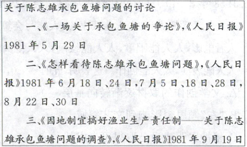 |三、《因地制宜搞好渔业生产责任制——关于陈志雄承包鱼塘问题的调查》,《人民日报》1981年9月19日|