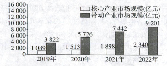 2019—2022年我国人工智能“核心产业”和“带动产业”的市场规模都在不断扩大,说明科技创新大大推动相关产业的发展,故B项正确
