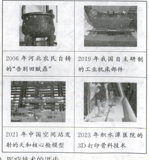 4.D 中国综合国力的不断提升 材料“告别田赋鼎”体现了农业税的废除;材料“自主研制的工业机床部件”体现了我国的科技和工业发展;材料“中国空间站发射的天和核心舱模型”体现了我国航空航天事业的发展;材料“积水潭医院的3D打印骨科技术”体现了医学科技的发展,说明推文从不同领域展示了我国综合国力的不断提升,故D项正确;医疗技术的进步和社会主义工业化的完成只能体现推文的部分内容,不能作为推文主题,故排除A、B两项;材料没有体现“国际影响力的扩大”,故排除C项。
