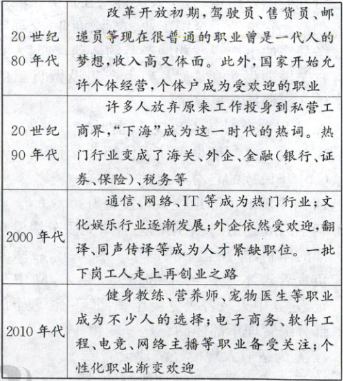 阐述:结合20世纪80年代、90年代、21世纪以来不同社会发展阶段相关内容,对职业变迁进行解读,要求符合史实,条理清楚,语言准确。