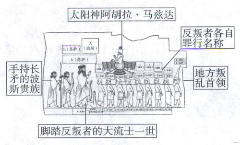 5.D 波斯帝国 根据示意图可知,浮雕中波斯帝国皇帝大流士一世脚踏反叛者,太阳神阿胡拉·马兹达居于浮雕正上方,体现了波斯皇帝的至高权威和当时君权神授的观念,该作品为研究古代波斯帝国的王权理念提供了史料,故D项正确;“被征服者”与材料内容不符,浮雕本意是体现大流士一世的功绩和权威,故排除A项;《贝希斯敦铭文》用古波斯语、埃兰语、阿卡德语三种楔形文字写成,故排除B项;材料没有涉及波斯帝国官僚体系和税收系统的相关内容,故排除C项。