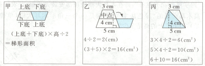 2. 学完平行四边形和三角形的面积计算方法后,几位同学尝试解决梯形面积的问题,想法有以下几种。三位同学的想法中,()。