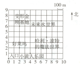 (1) 妈妈和曲妍从入口出发,先向东走500 m,再往北走600 m,刚好到达“功夫熊猫盖世之地”。在图中标出“功夫熊猫盖世之地”的位置,它的位置用数对表示是( , )。
